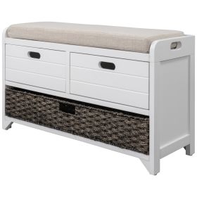 TREXM Rustic Storage Bench with 3 Drawers and 3 Rattan Baskets, Shoe Bench for Living Room, Entryway (White)