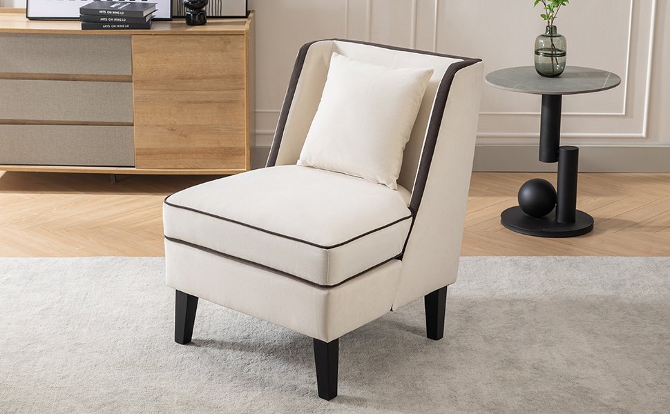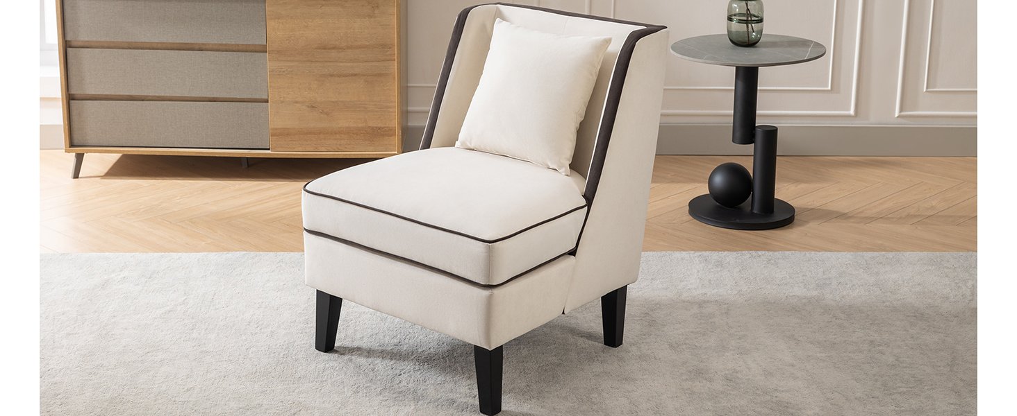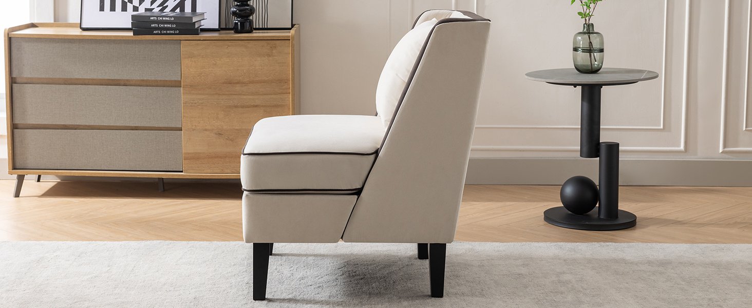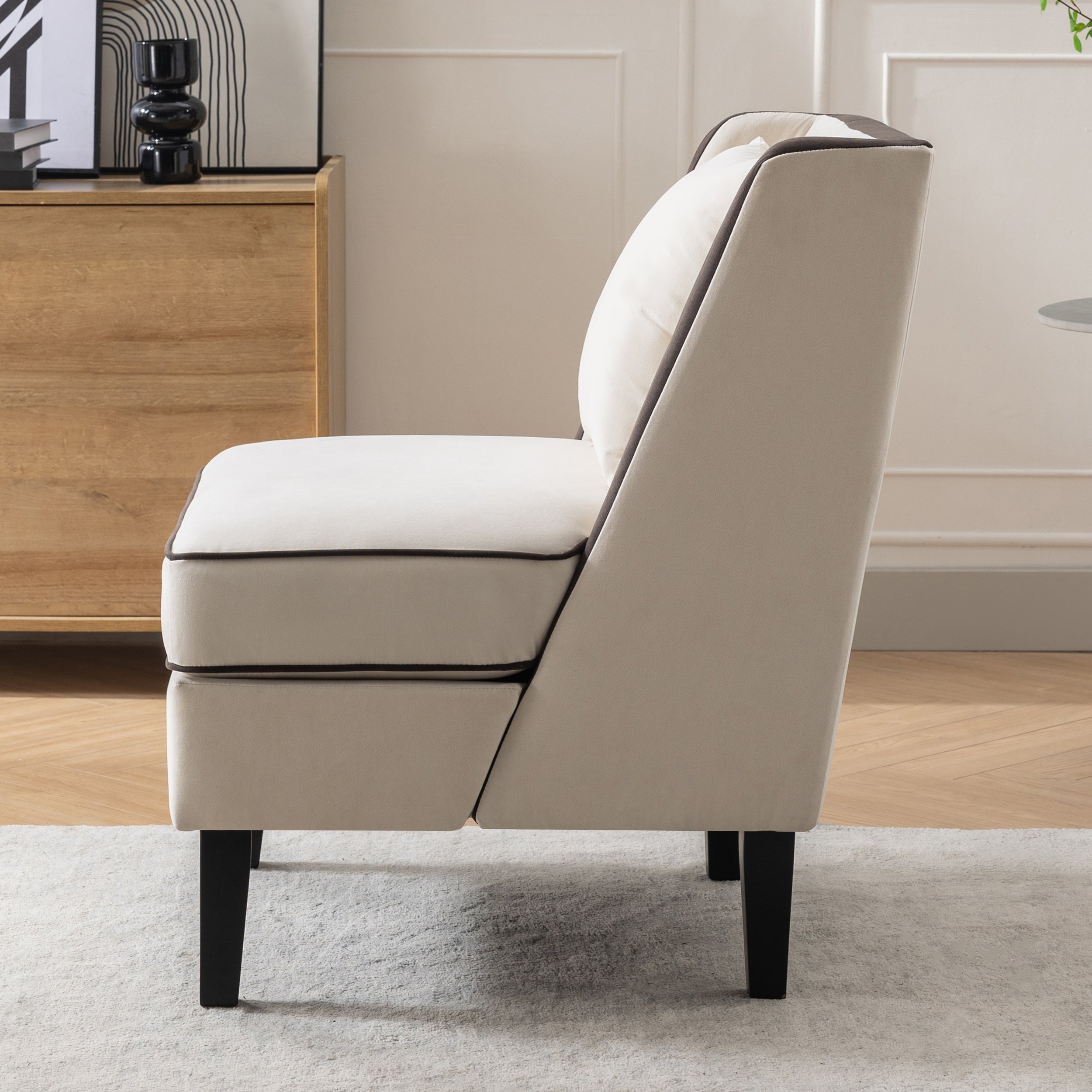 Velvet Upholstered Accent Chair with Black Piping, Cream and Black